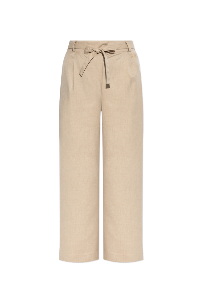I pantaloni beige con logo sono l'epitome di una raffinata semplicità e di un'eleganza moderna, realizzati per intenditori di stile esigenti. Il tessuto accuratamente selezionato, dalla texture delicata e leggermente fluida, avvolge la silhouette, garantendo un comfort eccezionale. Le gambe ampie e dritte, il taglio alla caviglia e le sottili pieghe anteriori conferiscono al modello una leggerezza naturale e un carattere sofisticato.