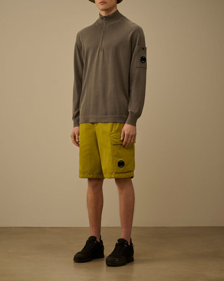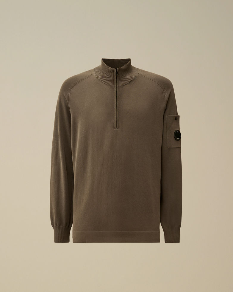 Maglione half zip realizzata in cotone crepe, un tessuto leggero e traspirante, caratterizzato da una texture naturalmente irregolare. Il modello presenta un colletto a costine e cuciture a contrasto sulle giromaniche. Completano il design il taschino con l’iconica Lente di C.P. Company sulla manica e i polsini a costine. La maglia è tinta in capo con trattamento 'Old' per un effetto vissuto e sfumature di colore uniche. Finezza 14. Made in Italy. Regular fit.