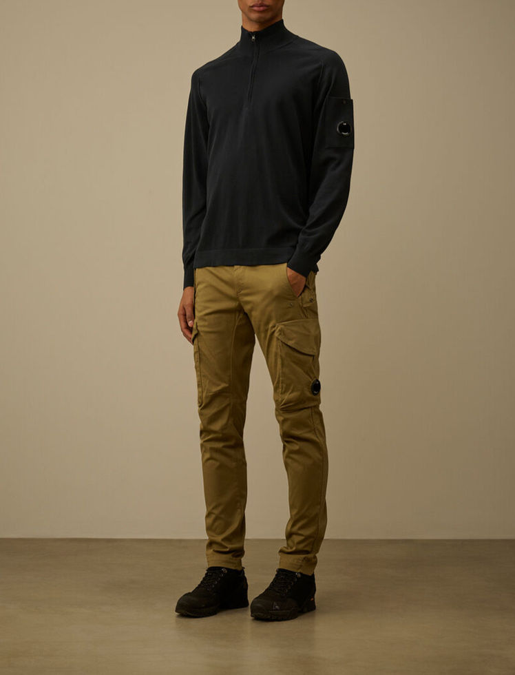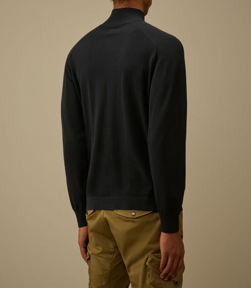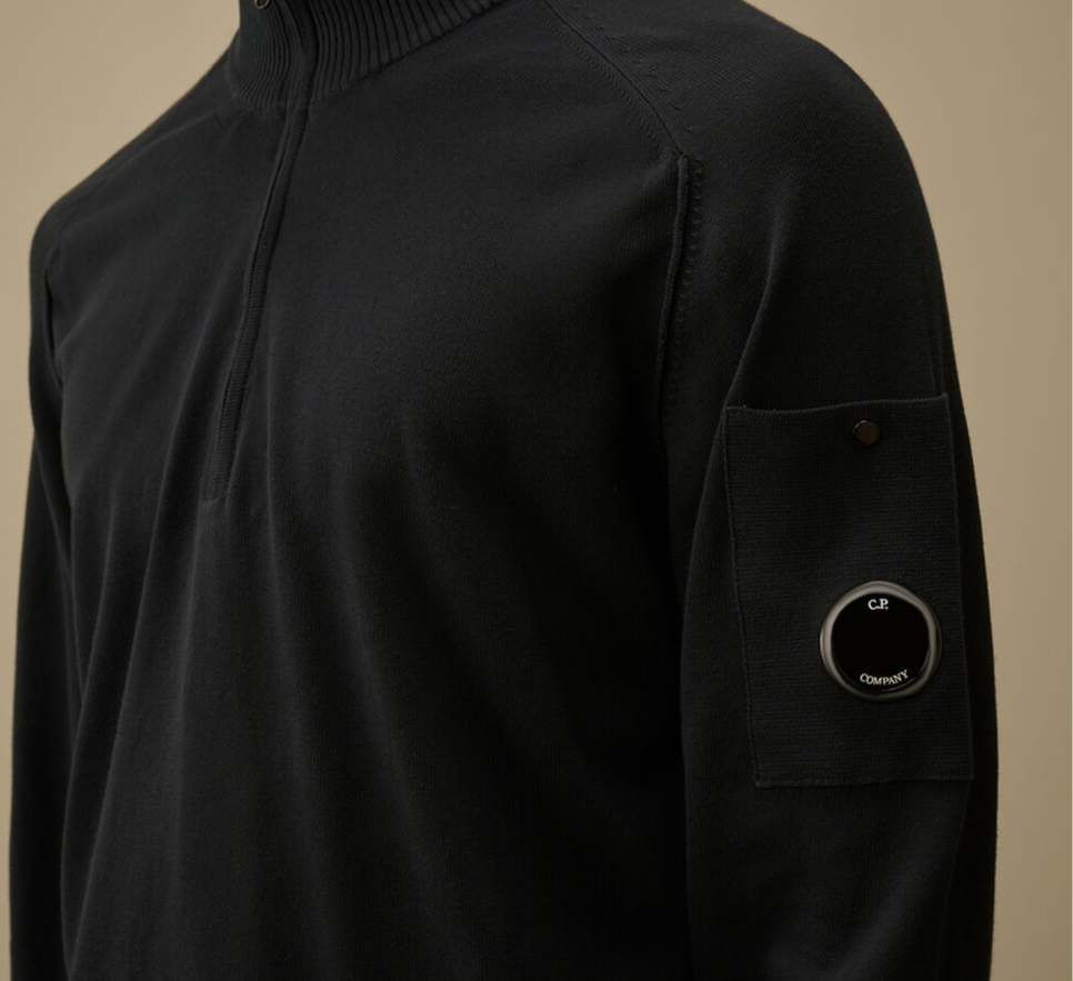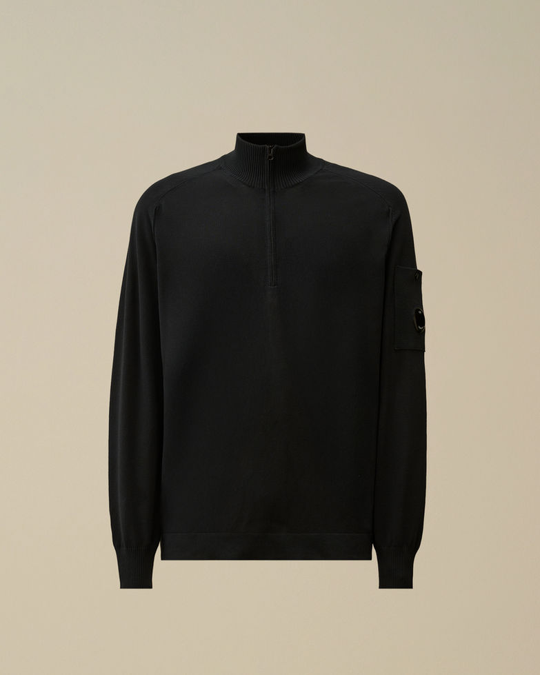 Maglione half zip realizzata in cotone crepe, un tessuto leggero e traspirante, caratterizzato da una texture naturalmente irregolare. Il modello presenta un colletto a costine e cuciture a contrasto sulle giromaniche. Completano il design il taschino con l’iconica Lente di C.P. Company sulla manica e i polsini a costine. La maglia è tinta in capo con trattamento 'Old' per un effetto vissuto e sfumature di colore uniche. Finezza 14. Made in Italy. Regular fit.