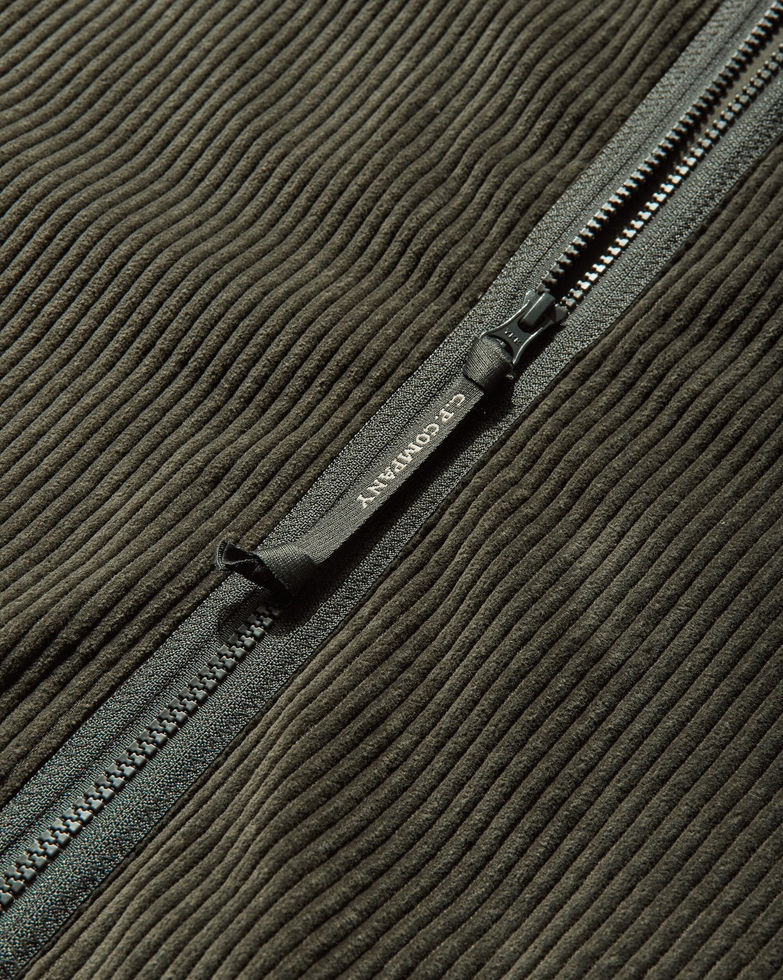 Felpa con cappuccio e zip in velluto a coste 350 di C.P. Company, colore: Ombra scura Felpa con cappuccio e zip realizzata in velluto a coste 350, un tessuto di cotone testurizzato dalla mano morbida. La felpa presenta un cappuccio fisso, chiusura frontale con zip e due tasche laterali. Rifinita con orlo a coste. Realizzata in 100% cotone.
