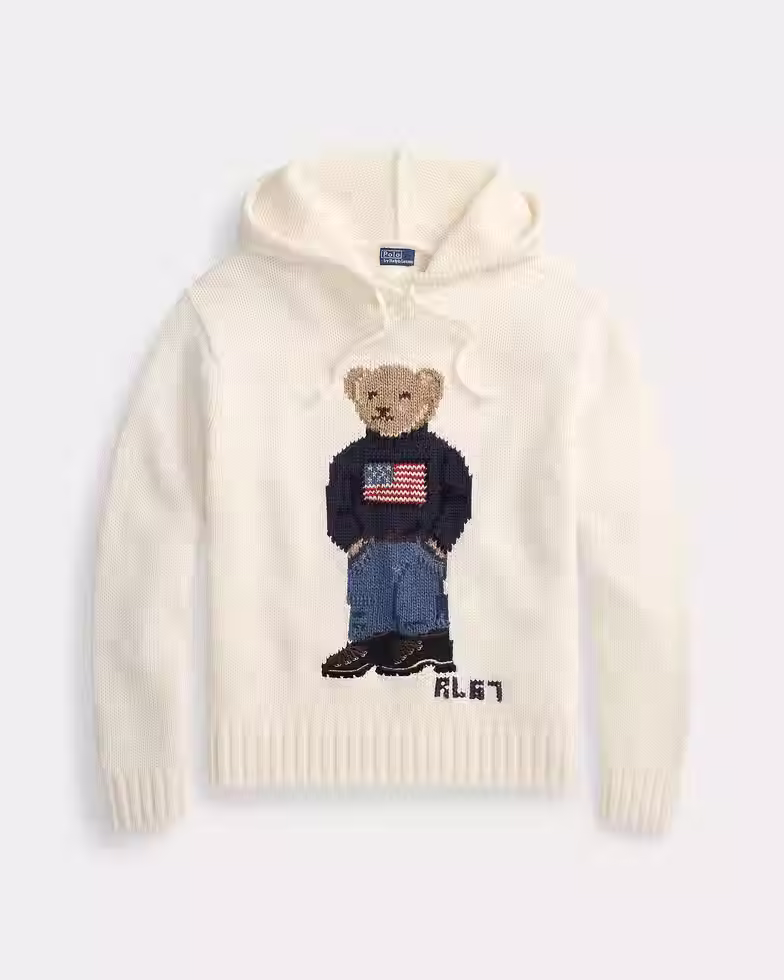 Questo modello con cappuccio presenta una versione in stile vintage della nostra amata mascotte realizzata in maglia a intarsi al centro sul davanti. Presentato per la prima volta nel 1991, il Polo Bear è ormai un simbolo dello stile Ralph Lauren, nonché espressione di raffinatezza senza tempo e fascino giocoso. Qui indossa l'iconica maglia con bandiera ed è impreziosito dalla scritta "RL 67" ricamata, che richiama l'anno di fondazione del marchio Polo.