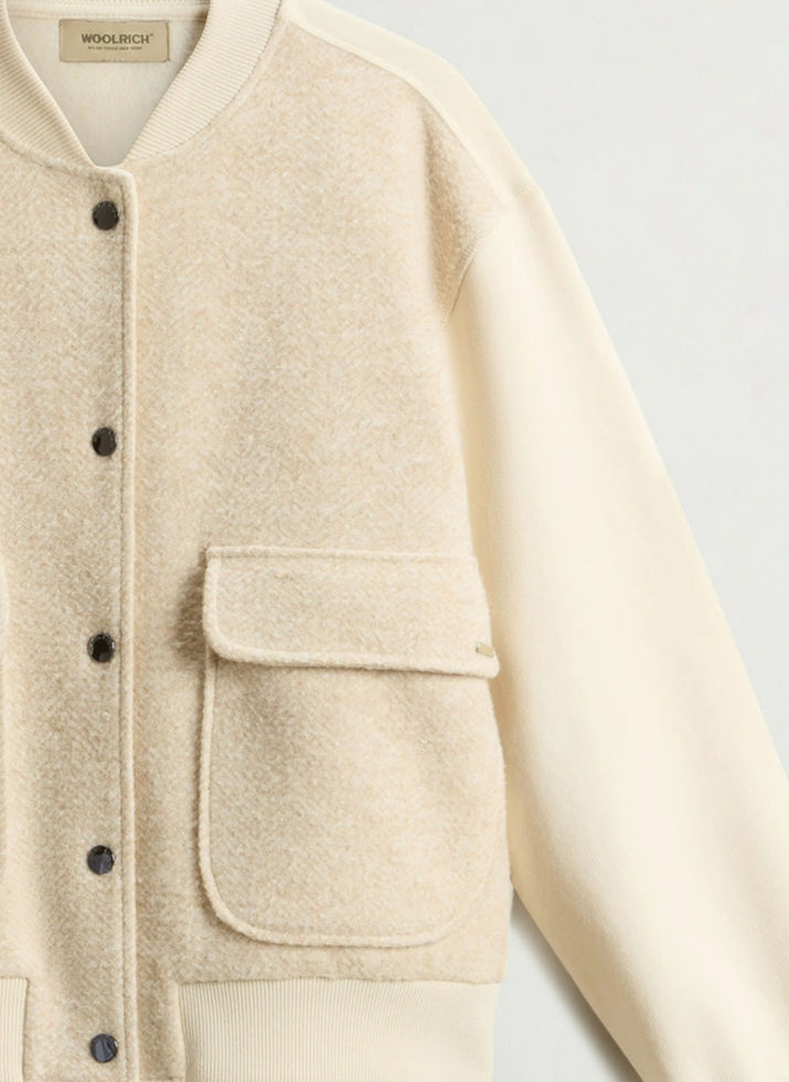 Questa felpa in puro cotone spazzolato è perfetta per aggiungere un tocco distintivo ai look di mezza stagione. Ispirata al classico bomber da baseball, si distingue per la parte anteriore in misto lana vergine, impreziosita da un motivo spigato che dona profondità alla texture del tessuto. È completata da una chiusura con bottoni a pressione e tasche applicate con patta, ideali per custodire l’essenziale. Collo, polsini e fondo a costine assicurano una vestibilità comoda e definita. La tasca sinistra è rifinita con una targhetta logata Woolrich.